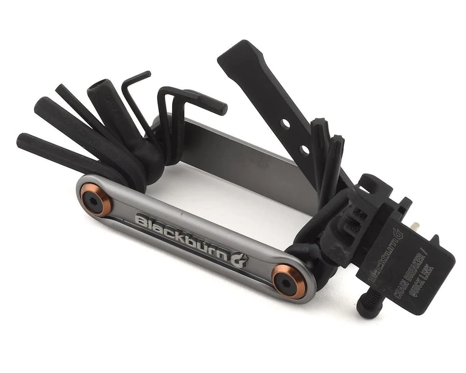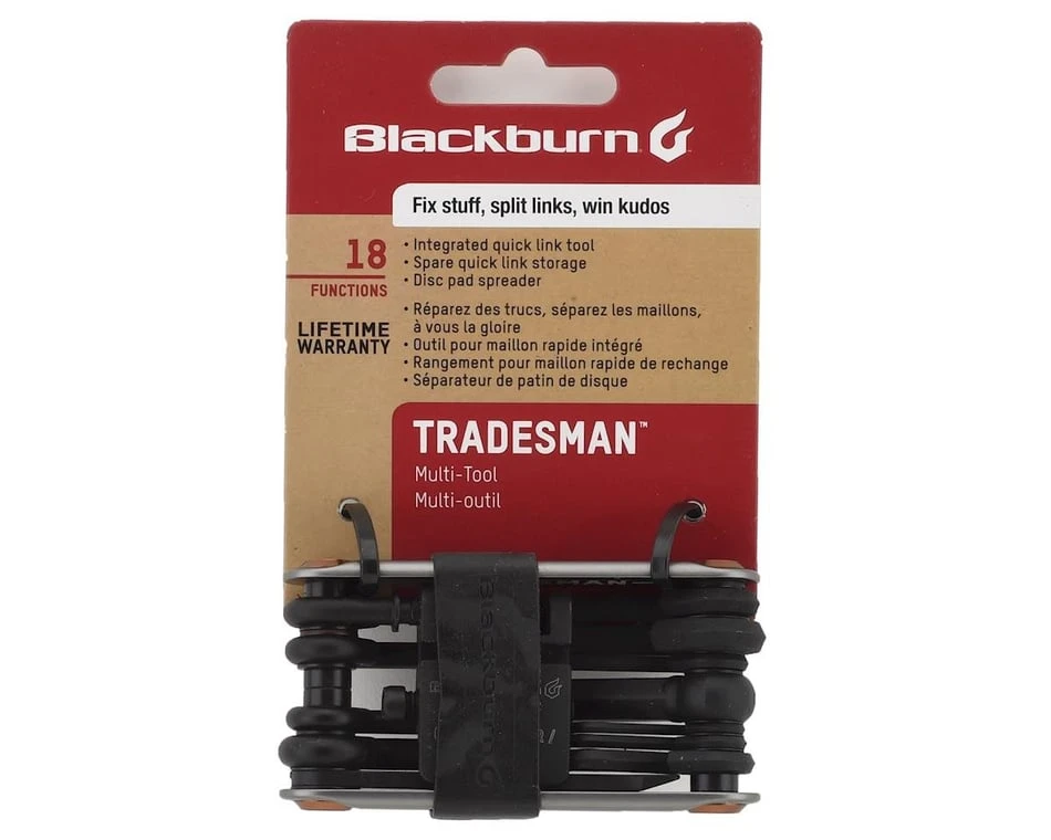 The Blackburn Tradesman Multi-Tool provides a superb selection of tools to tackle a wide range of repairs and maintenance out on the road or trail. What sets this multi-tool apart, however, is its complete chain repair system comprised of a standard chain tool, a clever quick link removal tool, as well as integrated storage for a quick link. Also included are an assortment of 7 Allen wrenches, a pair of Torx wrenches, a disc brake pad spreader, a Presta valve core tool, a spoke wrench, plus a flathead screwdriver. The Tradesman is well-crafted and portable enough to carry in a pocket of seat bag.