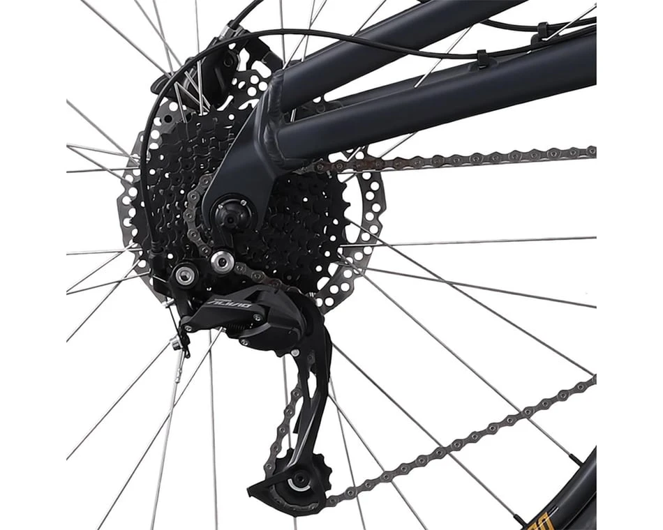 - Shimano hydraulic disc brakes provide consistent and controllable stopping power