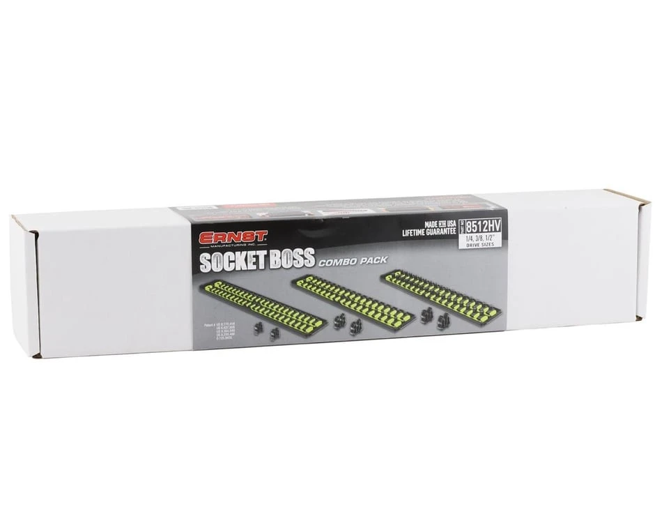 The Ernst Manufacturing Socket Boss Combo Pack includes three 18″ double rail Socket Boss sets – one 1/4″ drive, one 3/8″ drive, and one 1/2″ drive to organize up to 114 sockets (44 of 1/4”, 36 of 3/8”, and 34 of 1/2”). Each set includes an optional ratchet and extension holder for the corresponding drive type, allowing you to secure up to 6 ratchets or extensions to the rail. Plus, these are available in red, blue, or hi-viz yellow to make it easy to organize/identify metric from SAE tools.