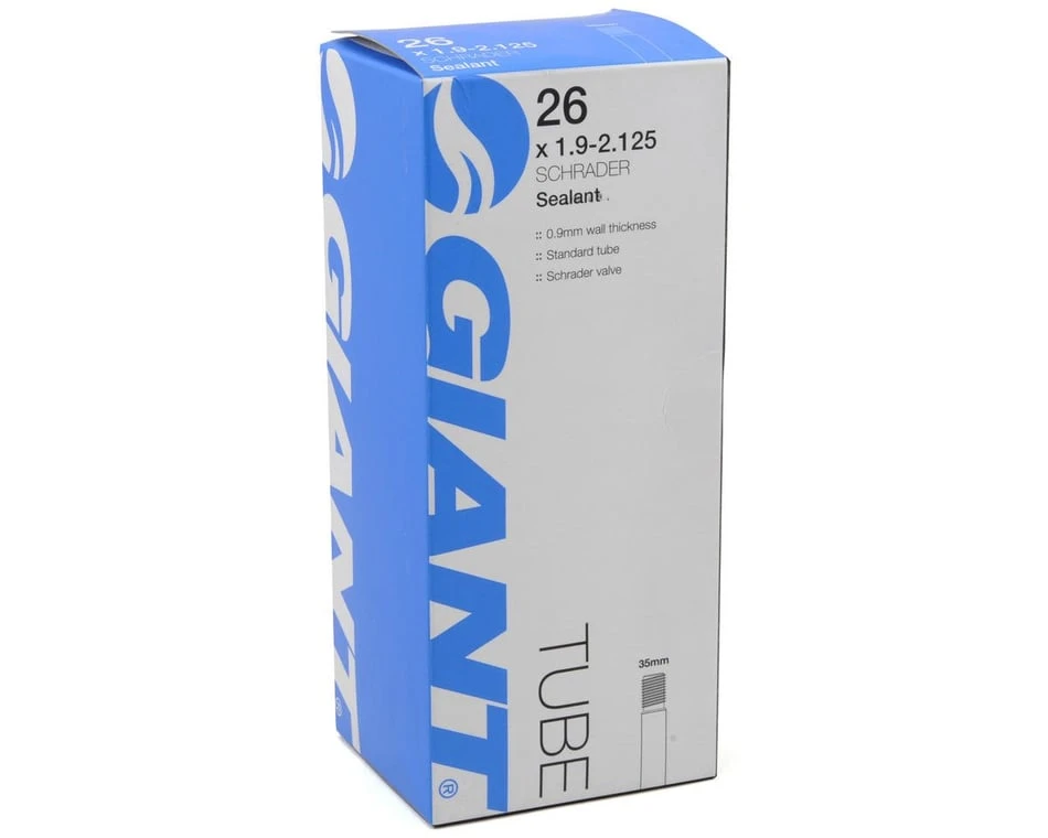 This is a Giant 26″ Sealant Inner Tube featuring a schrader valve stem. This tube utilizes a .9mm wall thickness and a factory installed liquid sealant to help seal punctures that may occur during a ride.
