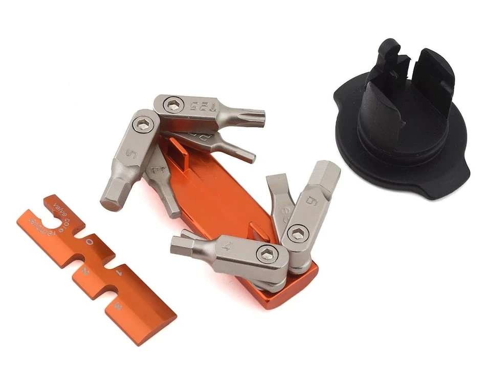 - Hides an 8-piece multi-tool and spoke key/valve core remover inside your steerer