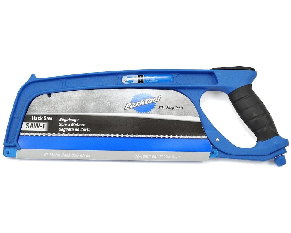 This is the Park Tool SAW-1 Hacksaw. All aluminum die cast frame construction, blade tension adjuster and comfortable handle make this the perfect hacksaw for the shop. SAW-1 includes a 12” (300mm) steel hacksaw blade in 32 teeth per inch (TPI).