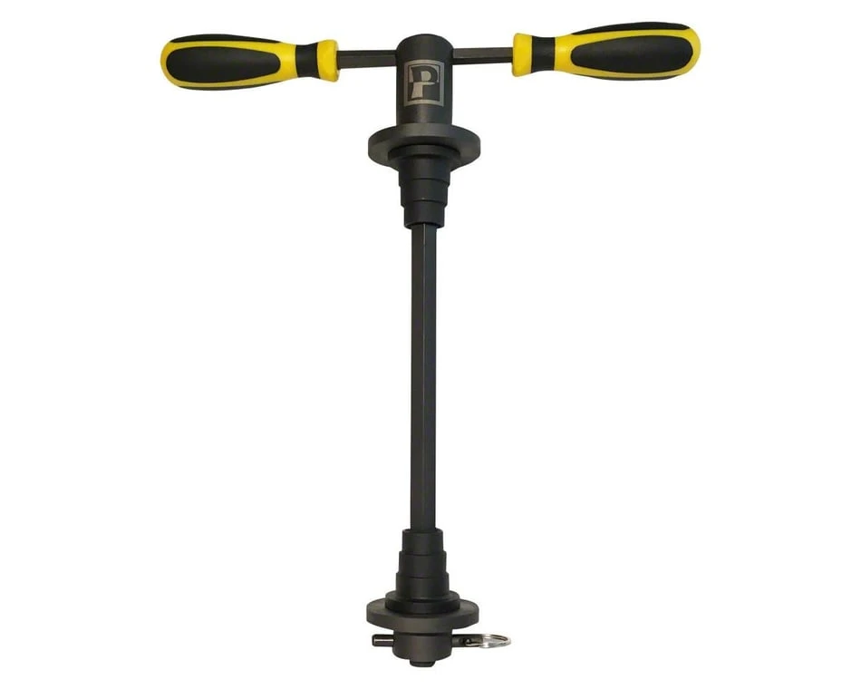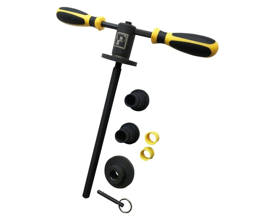 The Headset and Bearing Press is a professional quality tool designed to precisely and accurately install headsets as well as most press-fit bottom brackets. Features include removable, 33cm, ergonomic handles, a precision roller thrust bearing for smooth low-effort pressing, a quick release lower press module for fast tool positioning and removal, and an extensive working range from 60mm to 320mm for ultimate versatility. Two sets of adaptors are included with the press. Two Stepped Cup Bushings are sized to fit most 1 and 1⅛ standard headset cups and nest into press plates ensuring precise alignment. Two 22mm ID shim adaptors ensure precision alignment of any brand-specific cup bushings designed with 22mm inside diameter.