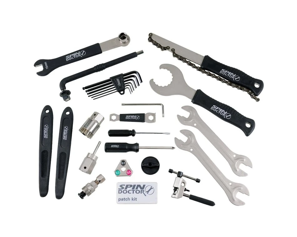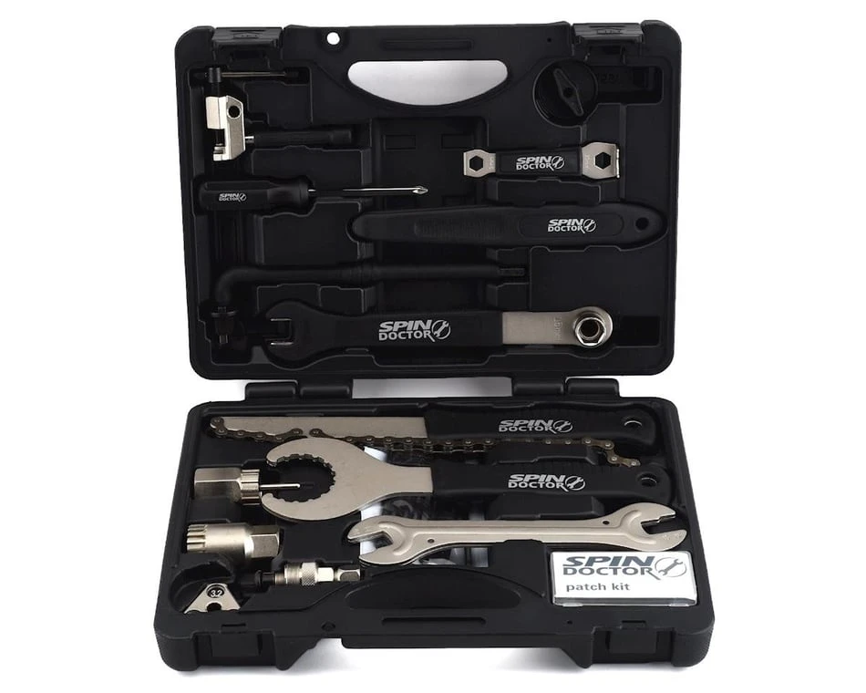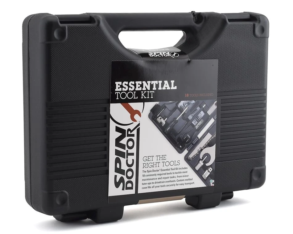 Updated to repair both road and mountain bike components, the Spin Doctor Essential Tool Kit comes with 18 commonly used tools to tackle most maintenance and repair projects, from minor tune-ups to drivetrain overhauls. Inside a custom-molded case, this entry-level kit is perfect for most maintenance and repair challenges.