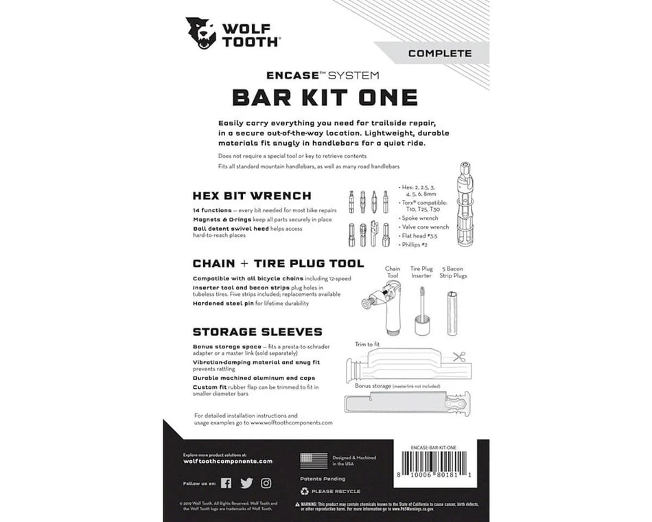 - Bar Kit One is the full system including multi tool, chaintool/tire plug tool, and sleeves